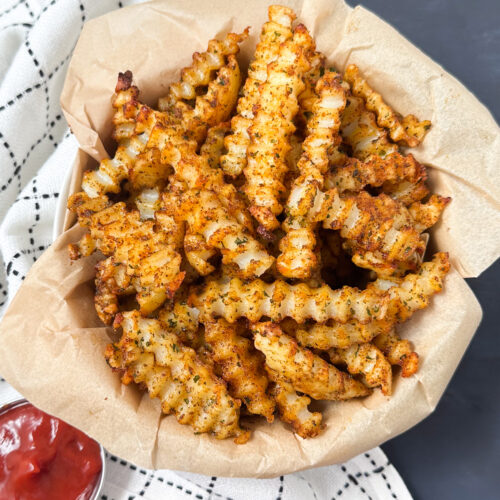 Crispy baked crinkle cut fries are the perfect side dish to serve with burgers, sandwiches and more. These fries are super easy to make and are a major crowd-pleaser! Serve with your favorite dipping sauces.