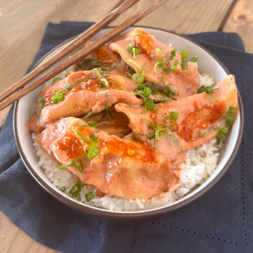 My delicious Curry Dumpling Bake is inspired by the viral TikTok dumpling bake made with Trader Joes Teriyaki Sauce, Curry and Coconut Milk with Chili Crisp.